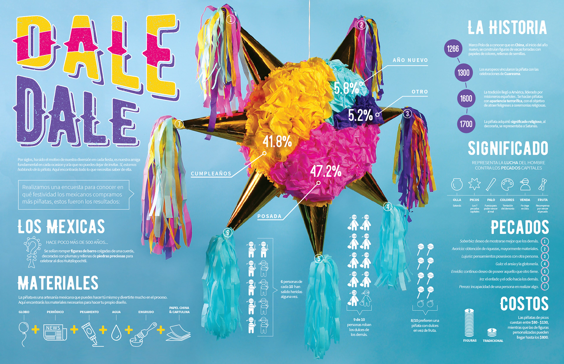 Infographic design about Mexican piñatas, their history, importance, and meaning.